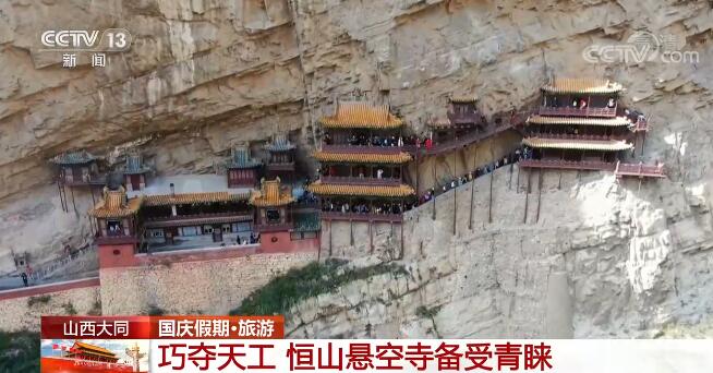 除了红色旅游在升温,国庆期间各大景区也迎来高峰客流。位于山西大同浑源县的恒山悬空寺景区因其建筑凌空构建、巧夺天工,吸引大量游客前来参观游览。