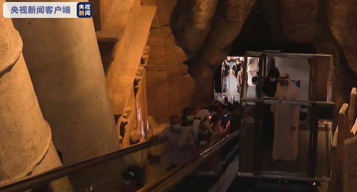 随后,乘坐自动扶梯自下而上,仿佛穿越一条直达沙特的时空隧道,两侧的墙壁上仿真建造了沙特被联合国教科文组织列入世界遗产名录的各种历史遗迹,并伴有沙特的舞蹈和戏剧,以及沙特常见动物等元素组成的灯光展示,给人身临其境的沙特旅游体验。