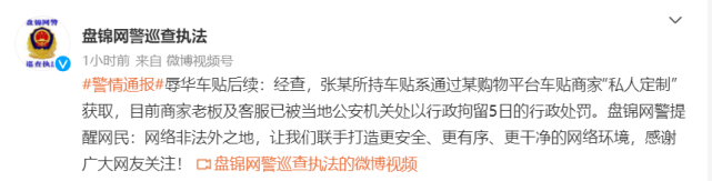 据盘锦市公安局网络安全保卫支队官微消息,盘锦市公安局网络安全保卫支队发布“辱华车贴”后续:经查,张某所持车贴系通过某购物平台车贴商家“私人定制”获取,目前商家老板及客服已被当地公安机关处以行政拘留5日的行政处罚。