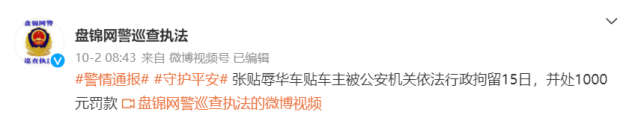 此前据媒体报道,辽宁盘锦一私家车公然张贴印有“支那制造”、“武运长久”等辱华字样的车贴,引发网友热议。接到网友举报后,盘锦市警方立刻传唤车主张某询问并对其进行批评教育,民警对该车主称“不抓你对不起全国人民,对不起所有牺牲的烈士”。10月2日,盘锦警方发布通报,张贴辱华车贴车主已被公安机关依法行政拘留15日,并处1000元罚款。