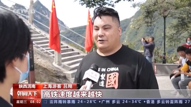 上海游客 吕翔:城市与城市、人与人的距离越来越近,高铁速度越来越快。我们上海过来到华山6个小时,以前不可以想象的.真的,以前很长时间坐铁路(火车),现在复兴号多快啊。人民生活条件越来越好,自己生活条件越来越好,真的。