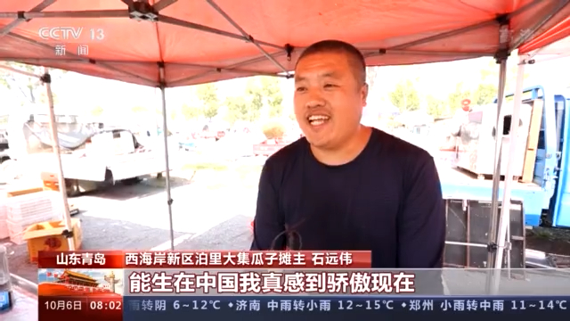 山东青岛西海岸新区泊里大集瓜子摊主 石远伟:咱们这个祖国太强大了,确实太好了,能生在中国我真感到骄傲现在。以前能拥有一辆摩托车,那就是很好的事了,现在你说汽车、楼房,这不是吹,真都买上了。就从我卖瓜子上就能看出老百姓生活好不好。我这是休闲食品对吧,老百姓没啥事能吃上这东西,它不就证明有钱了吗,对不对?