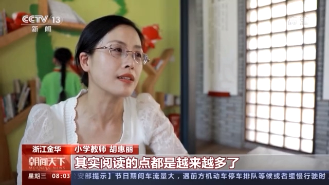 浙江金华小学教师 胡惠丽:就像我现在所处的这个“阅读吧”,在我们的生活当中就出现得越来越多。校园里、社区里,包括我们的家里,其实阅读的点都是越来越多了。