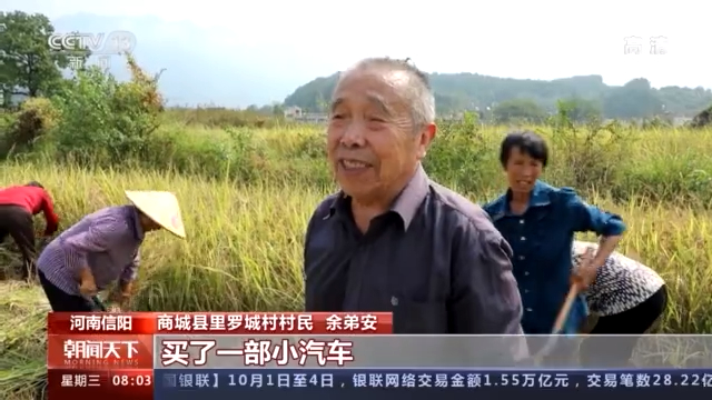 河南信阳商城县里罗城村村民 余弟安:我家今年我的孩子买了一部小汽车,我又添了一个冰箱,家家都有存款,日子过得甜。
