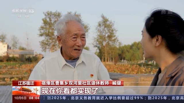 江苏宿迁宿豫区曹集乡双河里社区退休教师 臧健:我感觉我们的国家从1949年新中国成立以后,好像太阳从东边升起。在共产党领导下,你看,我们国家从弱到强,这几十年你看变化多大,是过去想都不敢想的。我想(上世纪)50年代流传的口头语“点灯不用油,耕地不用牛”,认为耕地不用牛,怎么耕呢?现在你看都实现了。一开始听说打电话能看见人。这怎么看呢?现在呢,俺这逢年过节,孙子没时间来家,用手机(视频)说话了。面对面说了,孙子来喝一杯。