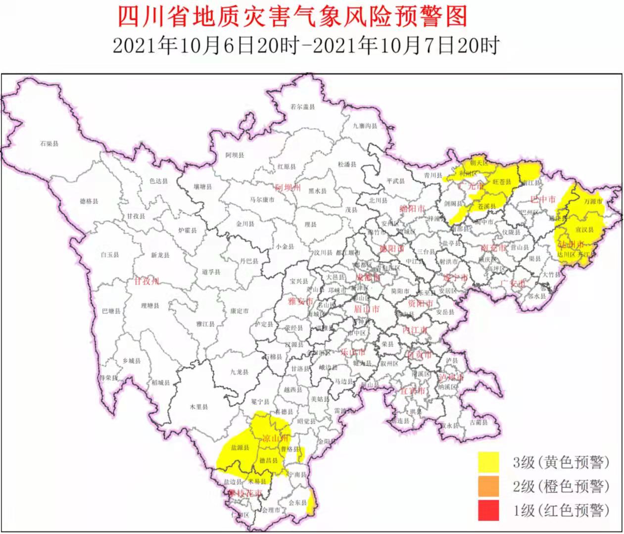 四川省地质灾害指挥部办公室今天(6日)发布消息称,10月6日20时—10月7日20时,四川省地质灾害气象风险3级黄色预警区域为广元利州区、朝天区、昭化区、旺苍县、青川县、剑阁县、苍溪县,巴中通江县、南江县、平昌县,达州通川区、达川区、万源市、宣汉县、开江县、大竹县,攀枝花米易县、盐边县,凉山州西昌市、会理市、盐源县、德昌县、会东县、宁南县、普格县、布拖县、昭觉县、喜德县、冕宁县等5市(州)29个县(市、区)。