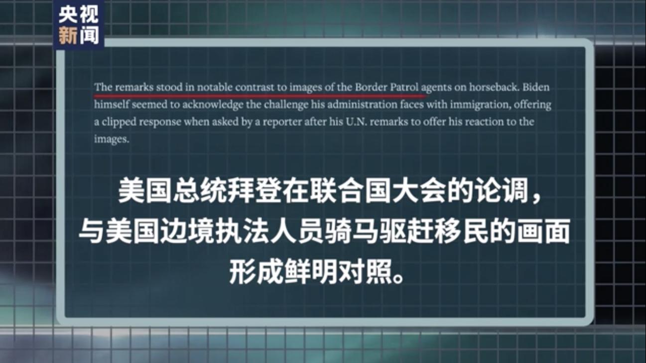 美联社则评论称,“美国总统拜登在联合国大会的论调,与美国边境执法人员骑马驱赶移民的画面形成鲜明对照。”