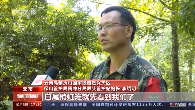 云南高黎贡山国家级自然保护区保山管护局腾冲分局界头管护站站长 李绍明:那个时候没有红外相机,因为雨季雾大,我们看不到白尾梢虹雉的时候,白尾梢虹雉就先看到我们了,或者被惊飞了。我们发现了两只,一个雌的一个雄的,由上往下滑翔。我们平常巡护的时候也能看到它的粪便,看到它的羽毛,但是实体照片、图片、视频我们从来没有拍到过。