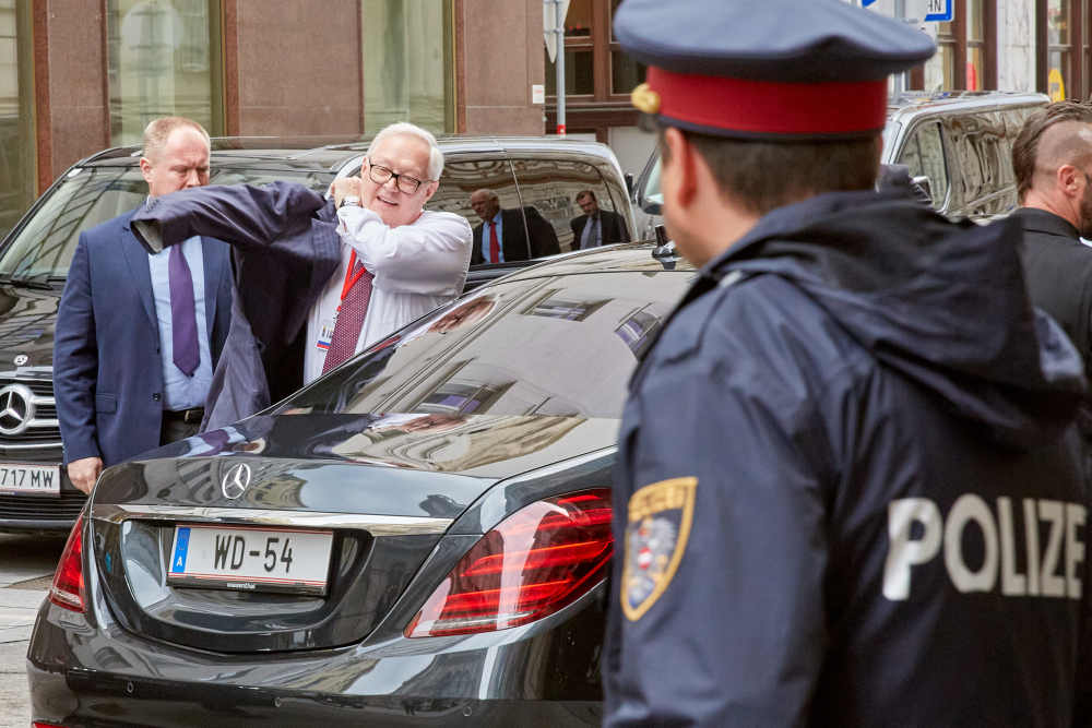 2020年6月22日,俄罗斯副外长谢尔盖·里亚布科夫(左二)抵达奥地利维也纳参加美俄军控对话。(新华社发 乔治斯·施耐德摄)