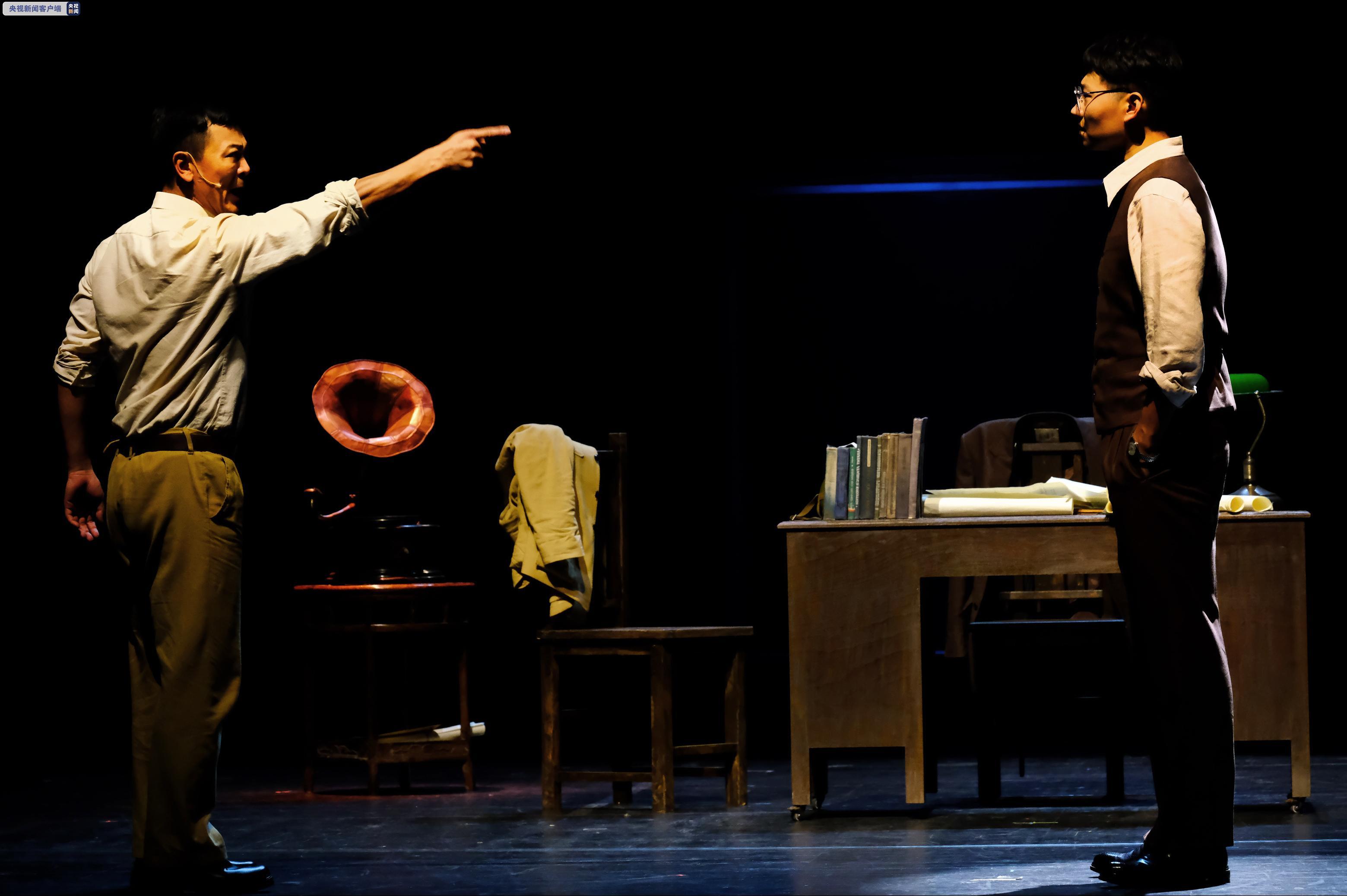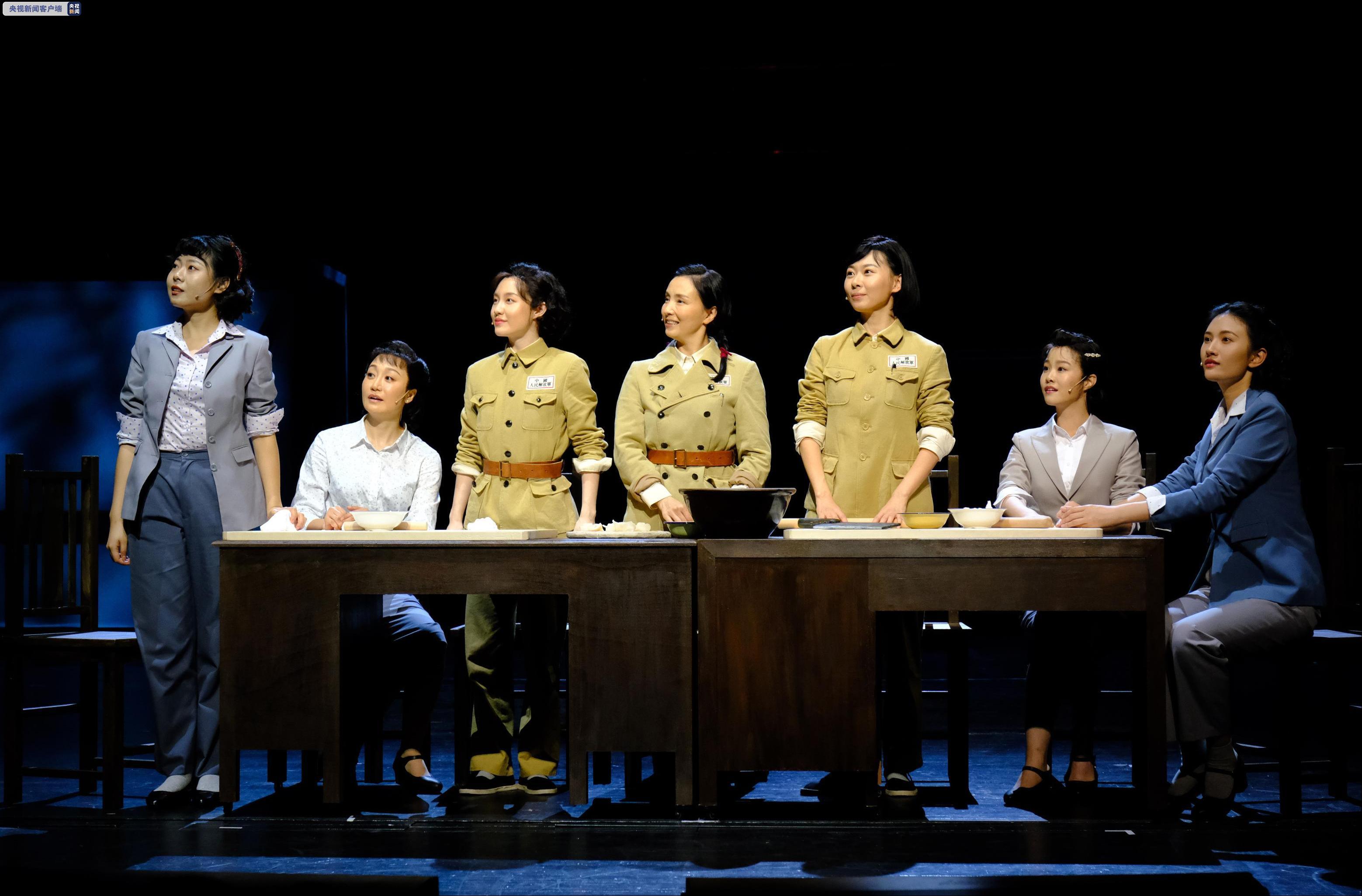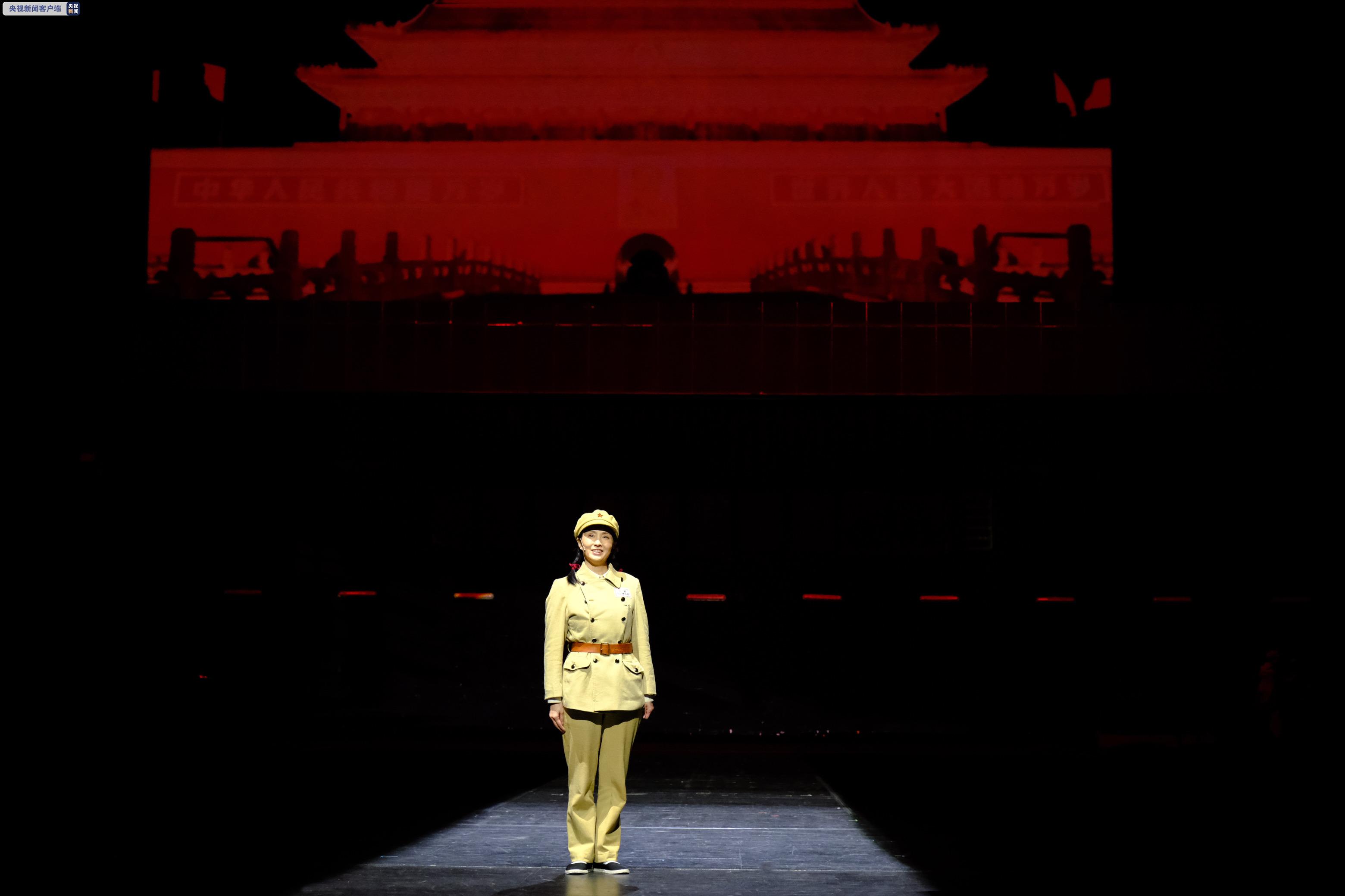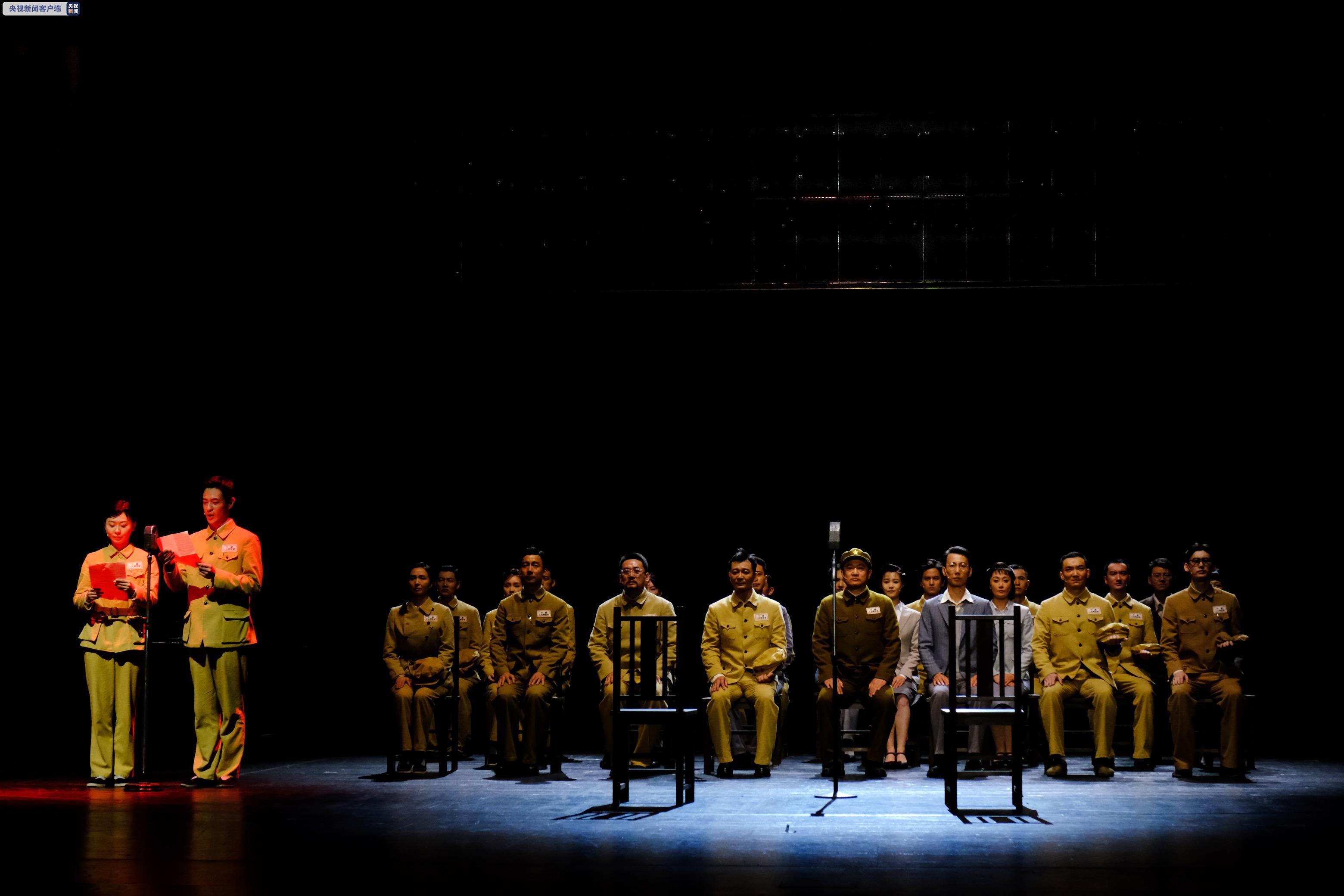 “各位听众!今天,北平宣告解放!”“英勇的人民解放军30万人渡过长江!”……舞台上,红黑相间的光影中,隐约出现了北平新华广播电台的工作人员,此起彼伏的男女广播声中,话剧《直播开国大典》正式拉开了帷幕。