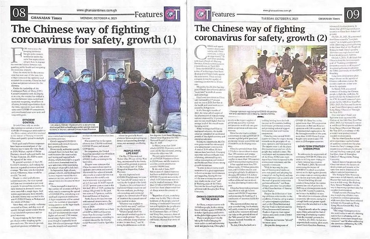 当地时间10月4日至10月5日,加纳《时报》刊登题为《追求生命健康和经济发展的“中国式”抗疫》的评论文章,赞扬中国抗击新冠肺炎疫情的工作。