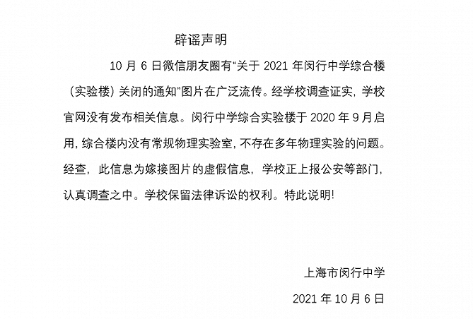 上海市闵行中学官网10月6日晚发布辟谣声明称,经学校调查证实,学校官网没有发布相关信息。闵行中学综合实验楼于2020年9月正式启用,综合楼内没有常规物理实验室,不存在多年物理实验的事实。经查,此信息为嫁接图片的虚假信息,学校正上报公安等部门,认真调查之中。学校保留法律诉讼的权利。