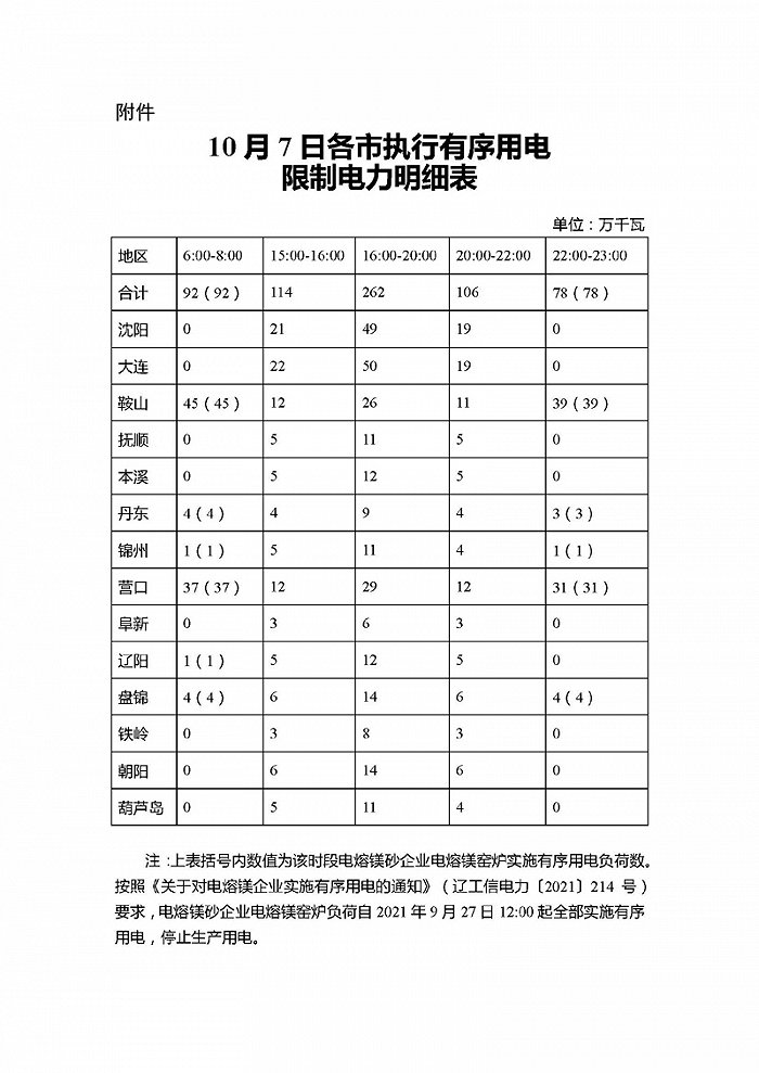辽宁继续实施有序用电,各市限制电力明细表公布