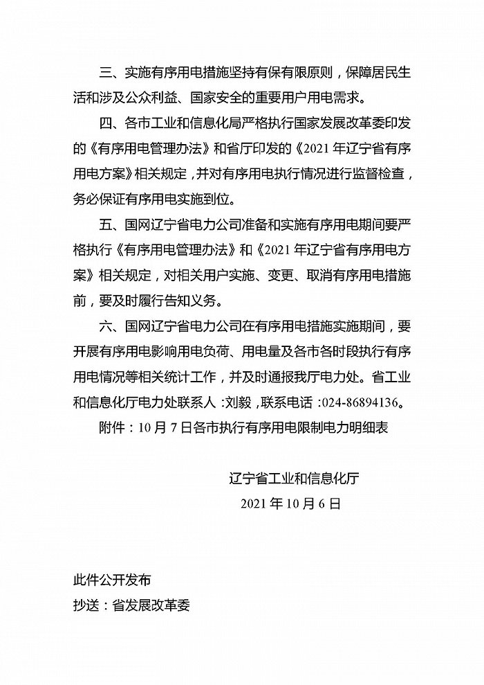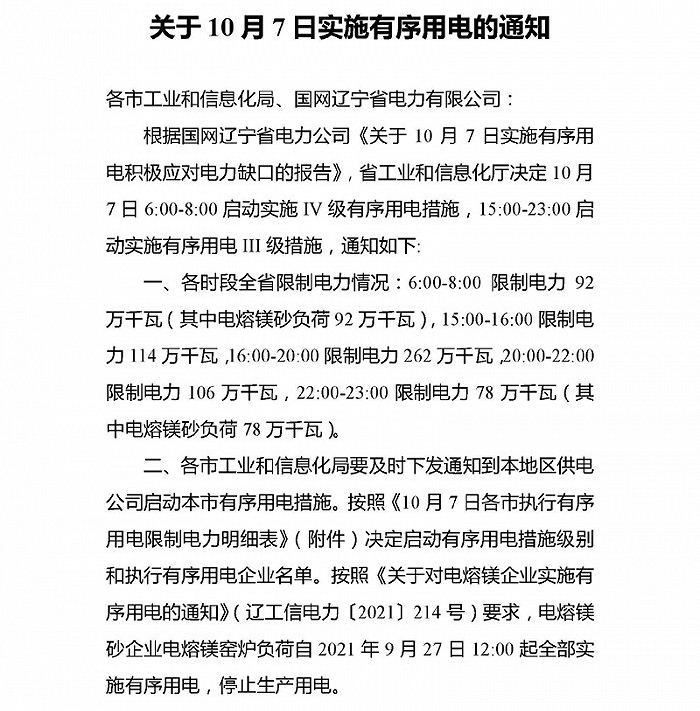 央视网消息:10月7日,辽宁省工信厅网站发布实施有序用电的通知提出,10月7日6:00-8:00全省启动实施有序用电Ⅳ级措施,15:00-23:00启动实施有序用电Ⅲ级措施。