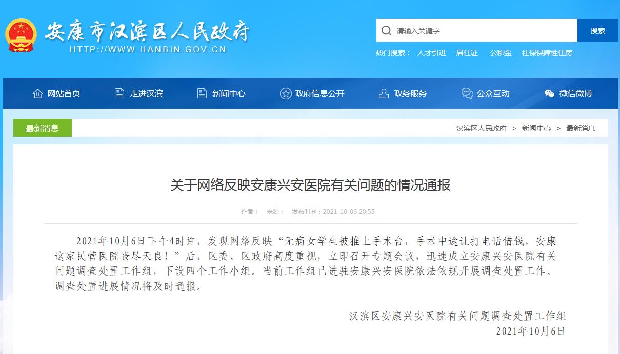 央视网消息:据安康市汉滨区政府网站消息,2021年10月6日下午4时许,发现网络反映“无病女学生被推上手术台,手术中途让打电话借钱,安康这家民营医院丧尽天良!”后,区委、区政府高度重视,立即召开专题会议,迅速成立安康兴安医院有关问题调查处置工作组,下设四个工作小组。当前工作组已进驻安康兴安医院依法依规开展调查处置工作。调查处置进展情况将及时通报。