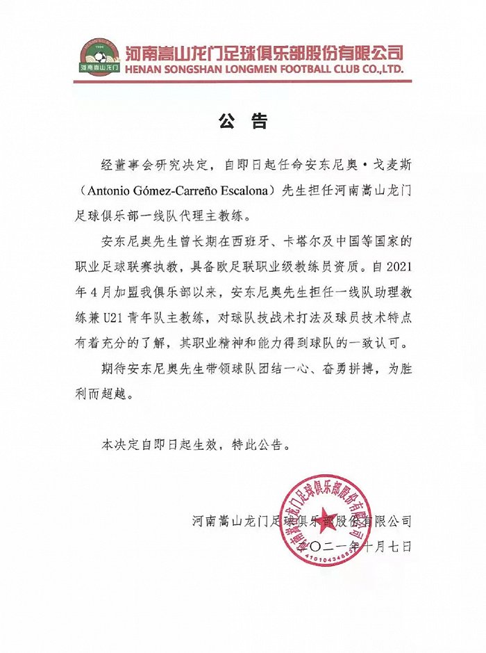 央视网消息:北京时间2021年10月7日,河南嵩山龙门足球俱乐部官方宣布与哈维尔解约,即日起任命安东尼奥·戈麦斯担任河南嵩山龙门足球俱乐部一线队代理主教练。