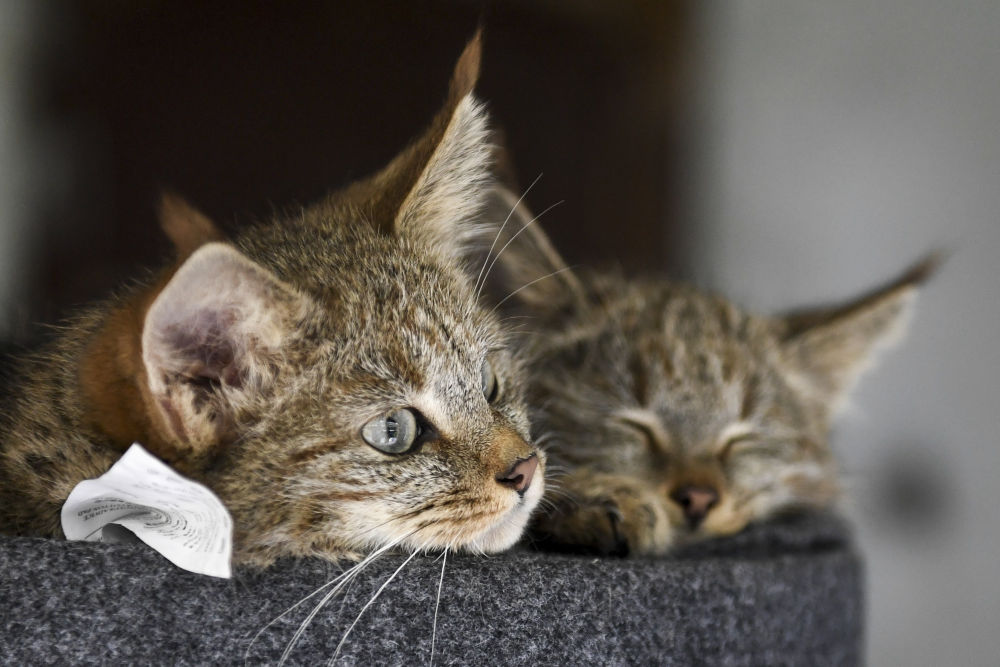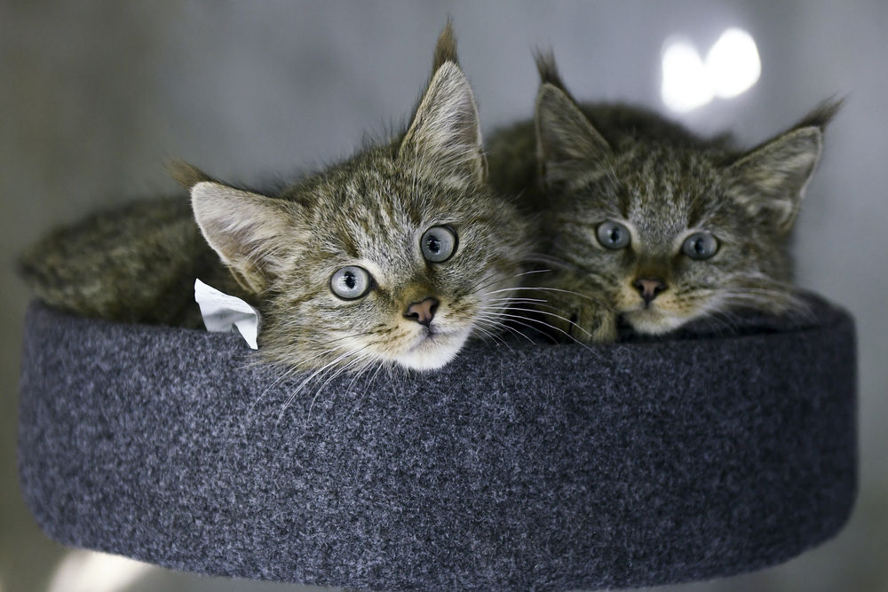 这是9月30日在西宁野生动物园拍摄的两只人工救助的荒漠猫幼崽。