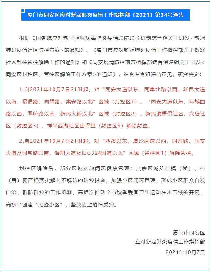 央视网消息:据“同安发布”消息,10月7日,厦门市同安区发布疫情防控第34号通告。自2021年10月7日21时起,对“同安大道以东,同集北路以西,新民大道以南,梧侣路、同辉路、集安路以北”区域(封控区1)、“同安大道以东,环城西路以西,凤岭路以南,新民大道以北”区域(封控区2)、新民镇梧侣社区、兴店社区(封控区3)、祥平西湖社区山坪里(封控区5)解除封控。自2021年10月7日21时起,对“西溪以东,厦沙高速以西,同莲路、同安大道及同新路以南,海翔大道及旧G324国道以北”区域(管控区1)解除管控。