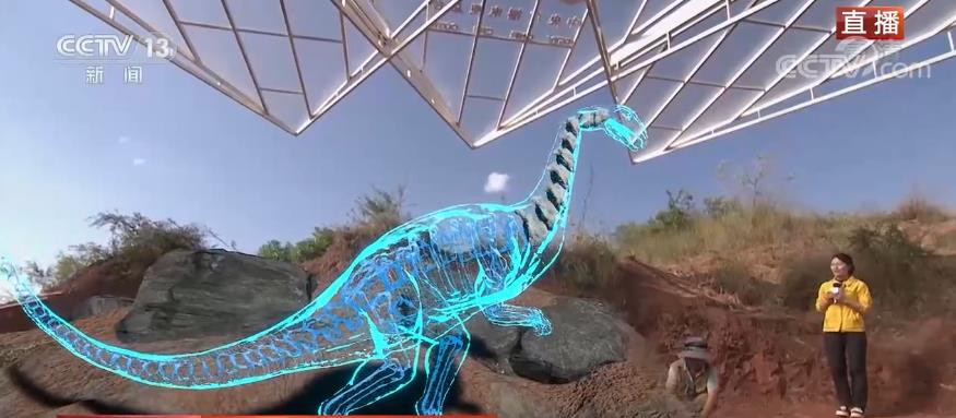 为了能够更好地呈现科学发现的细节,也为了让您更能身临其境感受侏罗纪世界,我们在前方也特别搭建了沉浸式混合现实系统,在科考现场就能实时看到根据骨骼化石复原的恐龙模样,实现野外互动直播。一眼穿越亿万年。