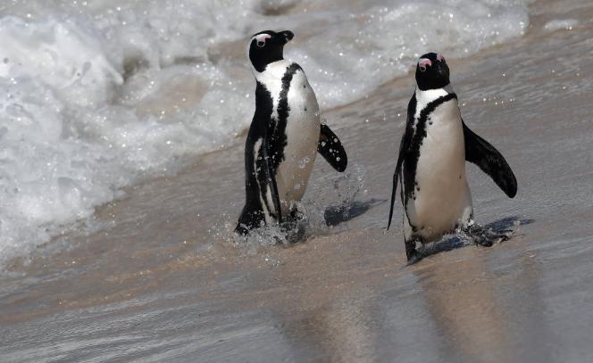 在南非贝蒂湾斯托尼波因特非洲企鹅保护区,两只非洲企鹅在嬉戏。