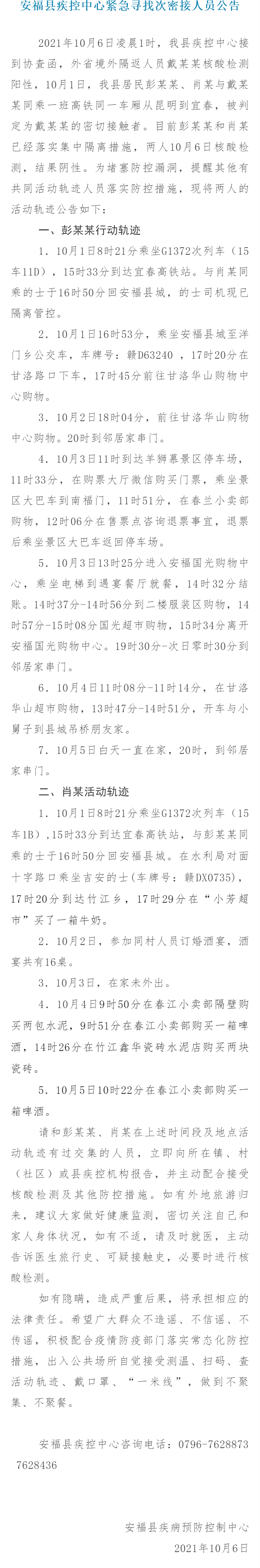 记者今日(8日)从相关部门获悉,2021年10月6日凌晨1时,江西省安福县疾控中心接到协查函,外省境外隔返人员戴某某核酸检测阳性,10月1日,安福县居民彭某某、肖某与戴某某同乘一班高铁同一车厢从昆明到宜春,被判定为戴某某的密切接触者。目前彭某某和肖某已经落实集中隔离措施,两人10月6日核酸检测,结果阴性。为堵塞防控漏洞,提醒其他有共同活动轨迹人员落实防控措施,现将两人的活动轨迹公告如下: