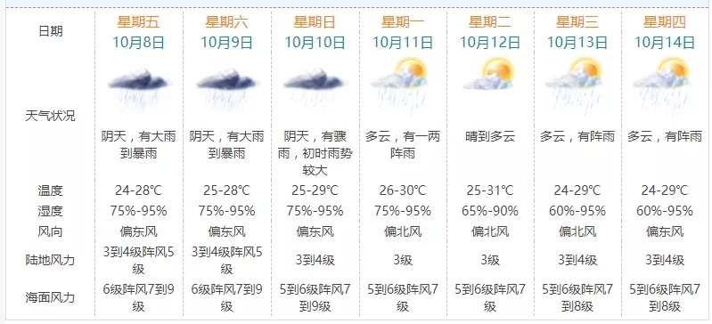 受其外围环流与冷空气共同影响,昨晚至今天08时珠海市普降大雨到暴雨,平均雨量42.9毫米,海面风力6-7级阵风8-10级。预计今天至9日珠海市有暴雨,局部大暴雨,海面大风维持;10日有骤雨,初时雨势较大,海面风力6级阵风7-9级。珠海市气象局10月8日08时40分已将台风预警信号升级为蓝色,暴雨黄色预警信号继续生效。