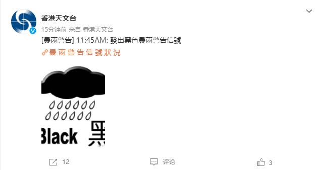 香港天文台在上午11时45分发出黑色暴雨警告信号。
