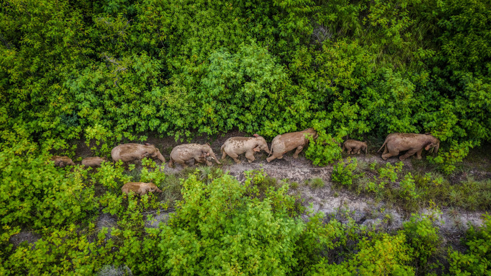 这是2021年8月9日在云南省玉溪市元江县境内拍摄的象群(无人机照片)。新华社记者 胡超 摄
