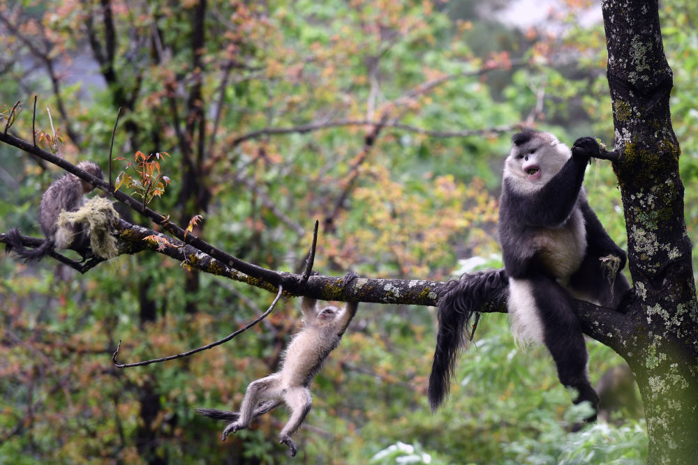 这是2020年5月23日在云南省迪庆藏族自治州香格里拉滇金丝猴国家公园里拍摄的滇金丝猴。新华社记者 王长山 摄