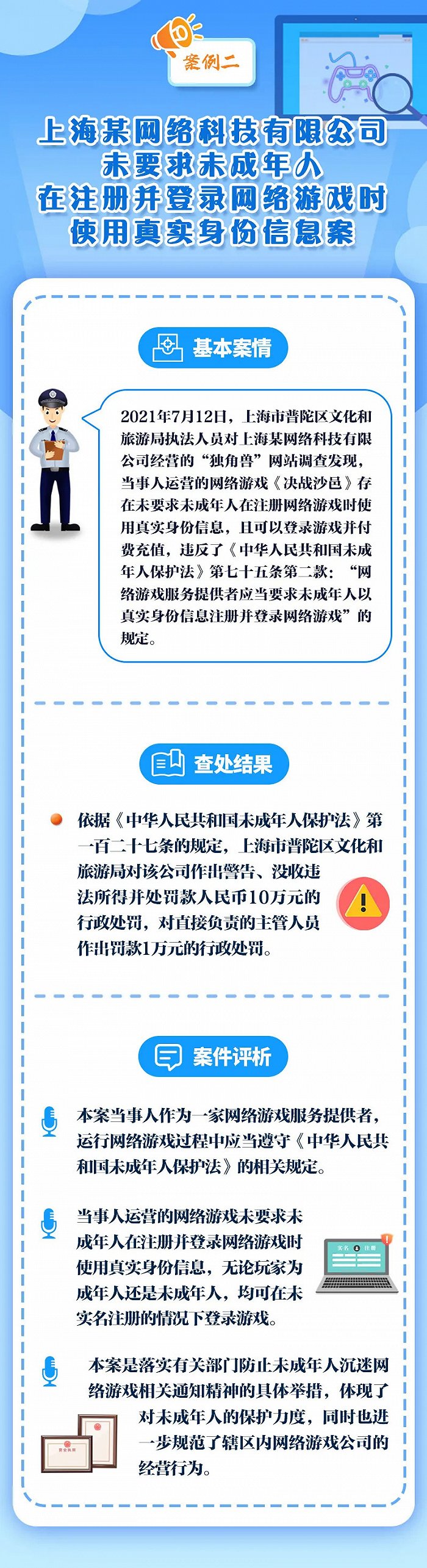 近期,文化和旅游部加大了网络监测和巡查力度,并督办了一批典型案例。为提高网络游戏企业及社会公众法律意识,更好地维护未成年人合法权益,挑选部分重点地区的5起典型案例予以公布,包括在限定时间以外为未成年人提供网络游戏服务、未要求未成年人在注册并登录网络游戏时使用真实身份信息、搭建私服运营网络游戏的执法案例。网络游戏企业应落实主体责任,严格遵守防止未成年人沉迷网络游戏的有关规定。社会公众发现网络游戏未落实未成年人防沉迷措施,可通过举报平台向有关部门进行举报。