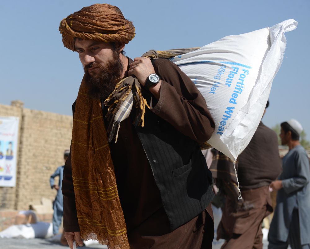 10月7日,在阿富汗坎大哈,一名男子领取由世界粮食计划署提供的物资援助。新华社发(萨瑙拉摄)