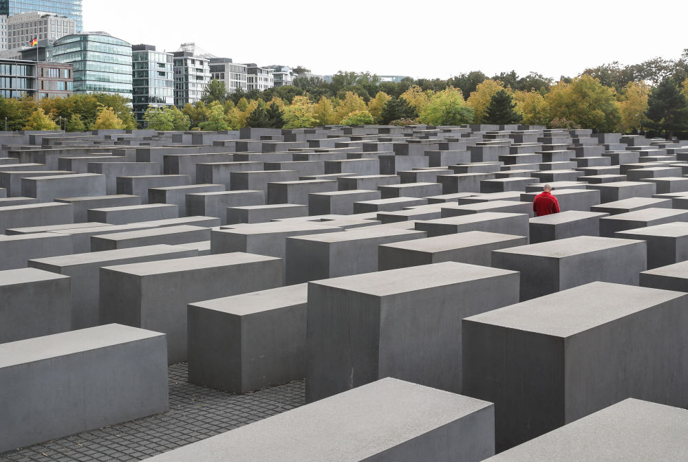 2019年9月19日,在德国柏林,一名男子在欧洲被害犹太人纪念碑间穿行。欧洲被害犹太人纪念碑位于柏林市中心,占地1.9万平方米,是由2711块大小不一的长方体水泥碑石组成的碑林。碑林下方是一个地下档案展览馆,展示欧洲犹太人当年惨遭纳粹德国迫害和屠杀的历史资料。(新华社记者单宇琦摄)