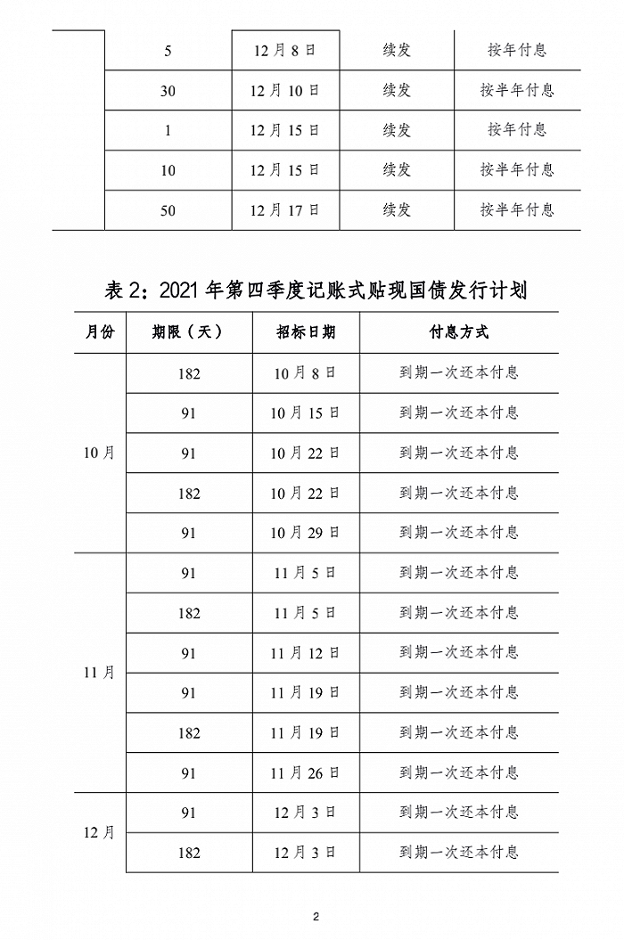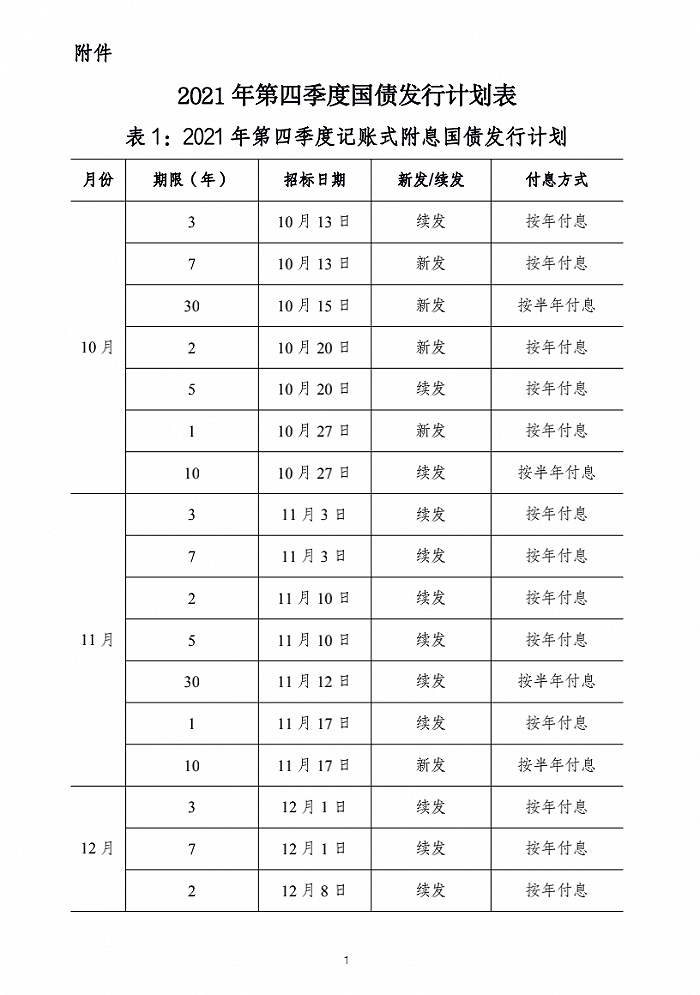现公布2021年第四季度国债发行计划(见附件)。执行中如有变动,以届时国债发行文件为准。