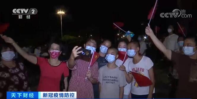 7日凌晨3时,在莆田市秀屿区的笏石镇,莆田全市最后一个中风险区调整为低风险区后路口解除封堵,一些社区居民挥舞着国旗与志愿者和工作人员齐声高唱。