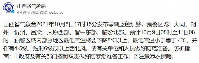据@山西省气象局 微博消息,山西省气象台2021年10月8日17时15分发布寒潮蓝色预警,预警区域:大同、朔州、忻州、吕梁、太原西部、晋中东部、临汾北部。预计10月9日08时至11日08时,预警区域内部分地区最低气温将要下降8℃以上,最低气温小于等于 4℃,并伴有4-5级、短时6级或以上西北风。请有关单位和人员做好防范准备。防御指南:1.政府及有关部门按照职责做好防寒潮准备工作;2.注意添衣保暖。