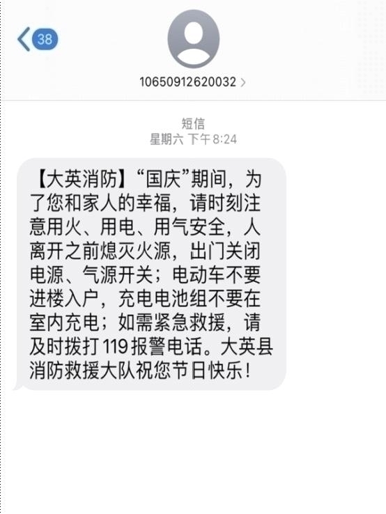为进一步加大国庆节期间消防安全宣传力度,进一步提高群众的消防安全意识,提升辖区火灾防控能力。国庆期间,大英县消防救援大队借助移动短信平台向广大人民群众发送消防安全提示短信20000条,提醒群众高度关注消防安全。