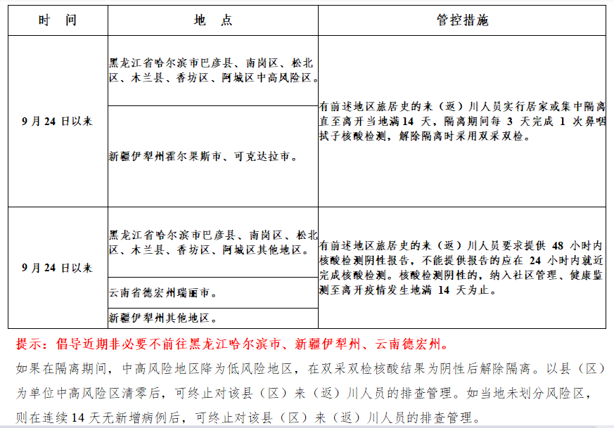 国庆长假期间,人员流动大大增加,为了保障您和家人的健康,建议所有省外来(返)川人员均及时就近进行一次核酸检测。