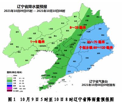 9日早晨至夜间,抚顺、本溪、丹东地区及庄河、岫岩有大雨到暴雨(30~70毫米),个别乡镇(街道)有暴雨到大暴雨(80~120毫米);锦州、阜新、朝阳、葫芦岛地区有小雨(1~8毫米);其他地区有小雨到中雨(8~25毫米);最大小时降雨量20~40毫米。