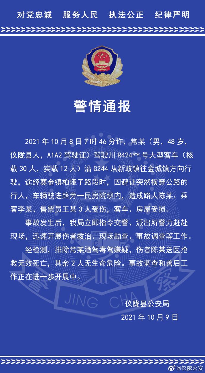 央视网消息:据“仪陇公安”微博消息,10月8日7时46分许,常某(男,48岁,仪陇县人,A1A2驾驶证)驾驶川R424*号大型客车(核载30人,实载12人)沿G244从新政镇往金城镇方向行驶,途经赛金镇柏垭子路段时,因避让突然横穿公路的行人,车辆驶进路旁一民房院坝内,造成路人陈某、乘客李某、售票员王某3人受伤,客车、房屋受损。经检测,排除常某酒驾毒驾嫌疑,伤者陈某送医抢救无效死亡,其余2人无生命危险。事故调查和善后工作正在进一步开展中。