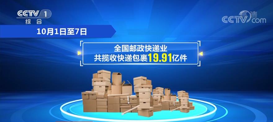 国家邮政局10月8日公布的监测数据显示,10月1日至7日,全国邮政快递业共揽收快递包裹19.91亿件,与2019年同期相比增长100.38%,与2020年同比增长28.31%;投递快递包裹19.17亿件,与2019年同期相比增长104.44%,与2020年同比增长25.71%。