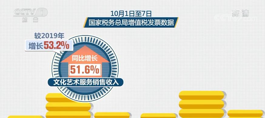 国家税务总局10月8日发布的增值税发票数据显示,国庆假期,文化艺术服务销售收入同比增长51.6%,较2019年增长53.2%;体育活动服务销售收入同比增长21%,较2019年增长62.9%;全国批发零售业日均销售收入同比增长9.9%,较2019年增长25.4%。居民线下购物消费平稳增长,“互联网+消费”服务持续扩大,线上零售销售收入同比增长12.7%,较2019年增长73.2%,带动快递服务销售收入同比增长10.4%,较2019年增长79%。