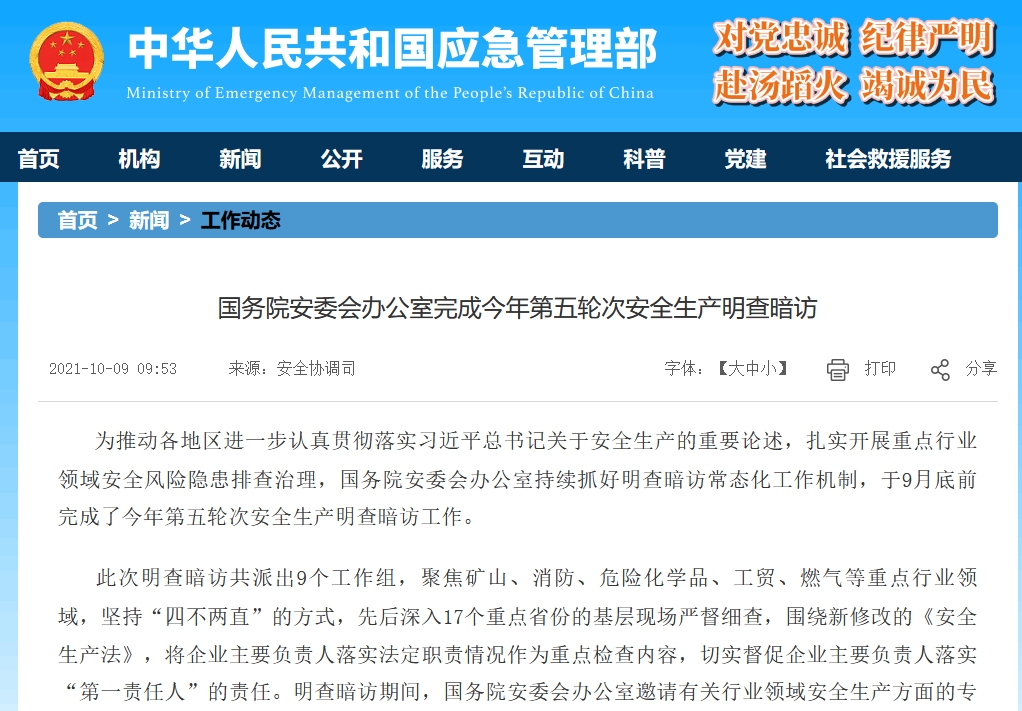 央视网消息:据应急管理部网站消息,为扎实开展重点行业领域安全风险隐患排查治理,国务院安委会办公室持续抓好明查暗访常态化工作机制,于9月底前完成了今年第五轮次安全生产明查暗访工作。