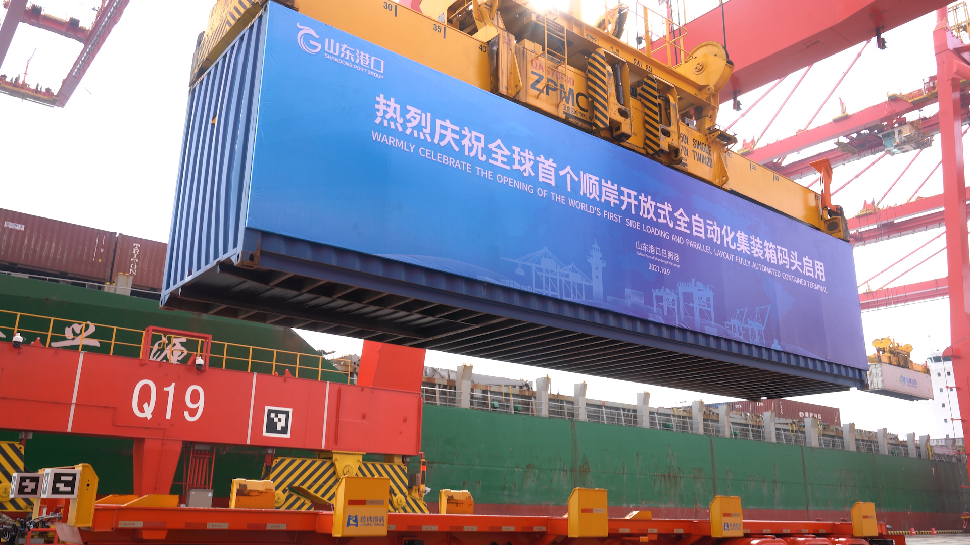 10月9日,全球首个顺岸开放式全自动化集装箱码头在山东港口日照港落地。
