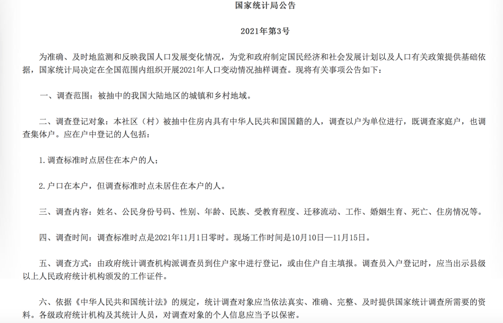 据了解,调查范围为被抽中的我国大陆地区的城镇和乡村地域;调查登记对象为本社区(村)被抽中住房内具有中华人民共和国国籍的人,调查以户为单位进行,既调查家庭户,也调查集体户。调查标准时点是2021年11月1日零时。
