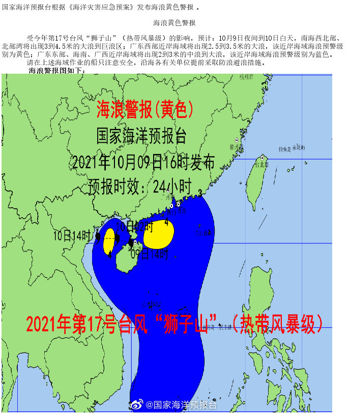 央视网消息:据“国家海洋预报台”微博10月9日消息,受今年第17号台风“狮子山”(热带风暴级)的影响,预计:10月9日夜间到10日白天,南海西北部、北部湾将出现3到4.5米的大浪到巨浪区;广东西部近岸海域将出现2.5到3.5米的大浪,该近岸海域海浪预警级别为黄色;广东东部、海南、广西近岸海域将出现2到3米的中浪到大浪,该近岸海域海浪预警级别为蓝色。