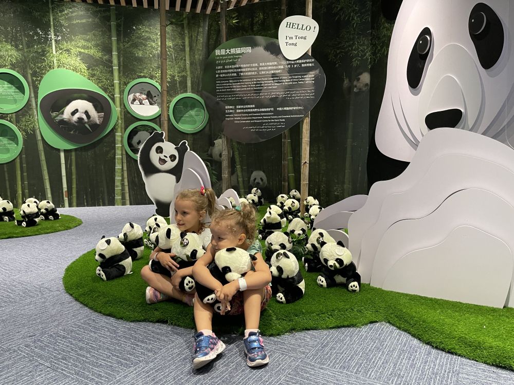 10月4日,在阿拉伯联合酋长国迪拜,两名儿童在迪拜世博会中国馆的大熊猫保护主题展厅里与熊猫玩偶合影。新华社记者苏小坡摄