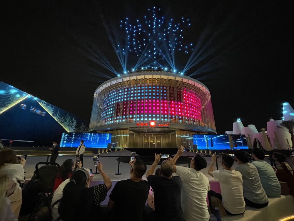 在外观如传统灯笼,寓意光明和团圆的中国馆,北斗卫星导航系统、中国高铁、海水稻种植等一系列与人类生活息息相关的创新成果吸引参观者驻足,也体现了中国愿与世界分享发展成果、与人类共创美好未来的愿景。