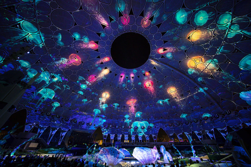 夜幕降临,世博园中心拥有360度投影面的穹顶上演灯光秀,巨大的半透明球形建筑变幻出迷人光影,仿佛隐喻着生生不息、拥有无限可能的地球。(记者:王健;编辑:唐志强、马晓燕)
