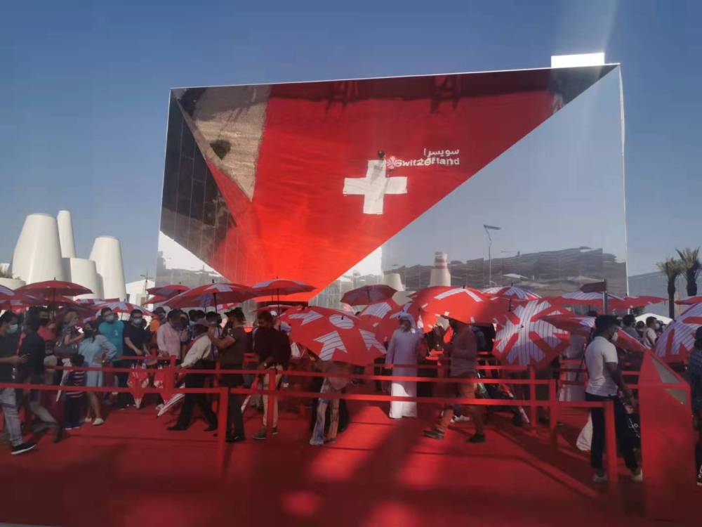10月1日,在阿拉伯联合酋长国迪拜,游客们在世博会瑞士馆门口排起长队。新华社记者王健摄
