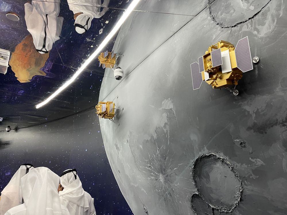 10月1日,在阿拉伯联合酋长国迪拜,参观者在世博会中国馆观看航天科技板块的展览。新华社记者苏小坡摄
